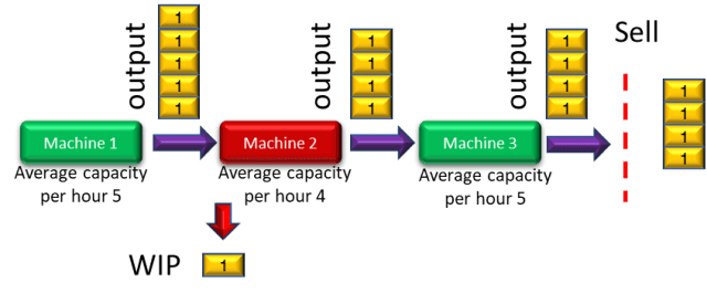 A quick reminder on the basics of a bottleneck, a bottleneck is anything that limits the flow of product in the system. For example, in the flow below machine 3 is the bottleneck, it produces less than the other machines.