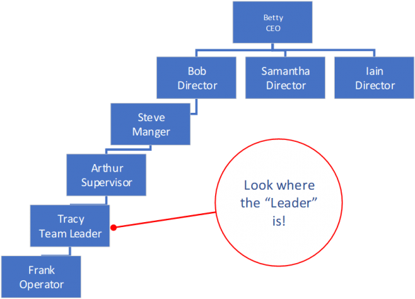 Now all of that that may sound lofty, and it should, becoming a leader is no mean feat yet look around your organisation and how many people in your organisation have the title "leader" and as you spot them think where about in the hierarchy do they sit? Surely at the very top!? Nope, usually towards the bottom. It'll normally be something like this: