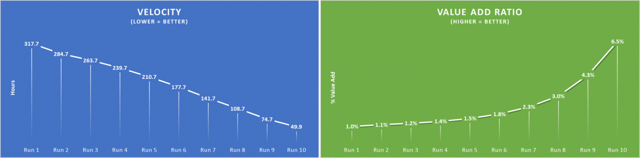 A word of caution, however, ignore the quality measure at your peril. You can easily improve your velocity by automation alone and have zero impact on quality, changes to your value adding time also can mask poor quality so again you need that 3rd measure of quality at all times.