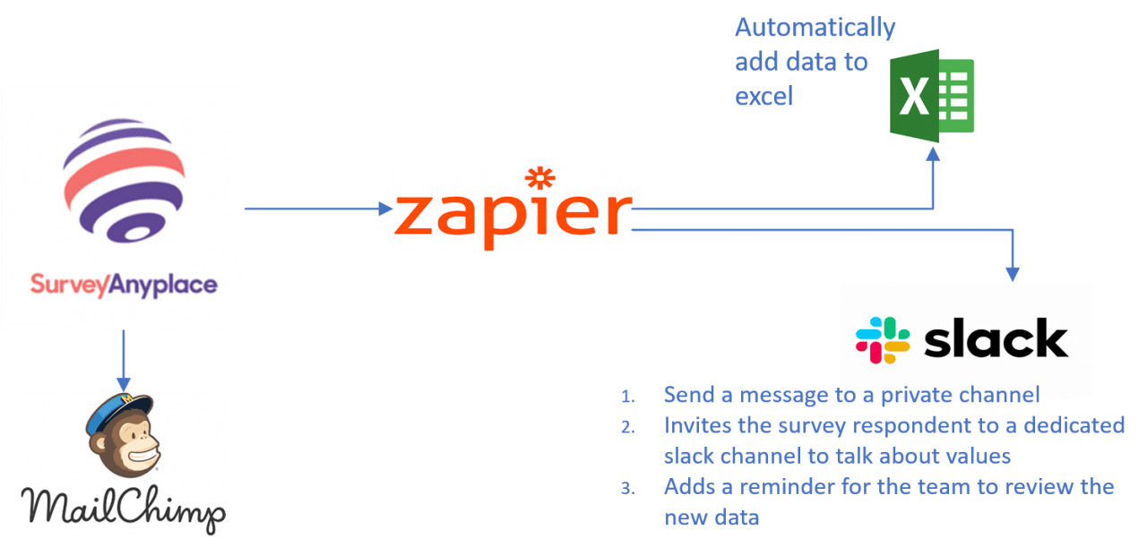 Then we used Zapier to link it to excel to automatically download the data to our external spreadsheet, again we could download the data from Survey Anyplace as a single batch if we wanted to, but we wanted to populate it as the data came in. We also set up a Slack channel that the Senior Leadership team could use to chat about the results in real time and look at the feedback we were getting since they were dispersed around the country. We also set an additional channel for people responding to the survey to be able to log in and discuss things in more details as we posted updates there as well of some of the feedback points we got and wanted more thoughts on those points raised, essentially converting the survey into an organisational conversation. So, the scheme basically looked like this: