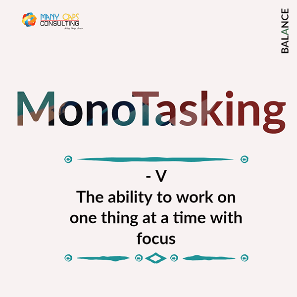 Monotasking is a dumb way of saying just do one thing at a time!... but have a plan, yep stop what you are doing and take some time, maybe 20 or 30 minutes to just think about what all you must get done this week, this month. Include everything, work & family and don't forget about a little time for yourself to help recharge those resilience muscles. Once you have done that think about the things you would like to get done but it doesn't matter if they happen this week or the next, add them to your list (I add them in a different colour, so I know what is important now and what has some slack time linked to it).