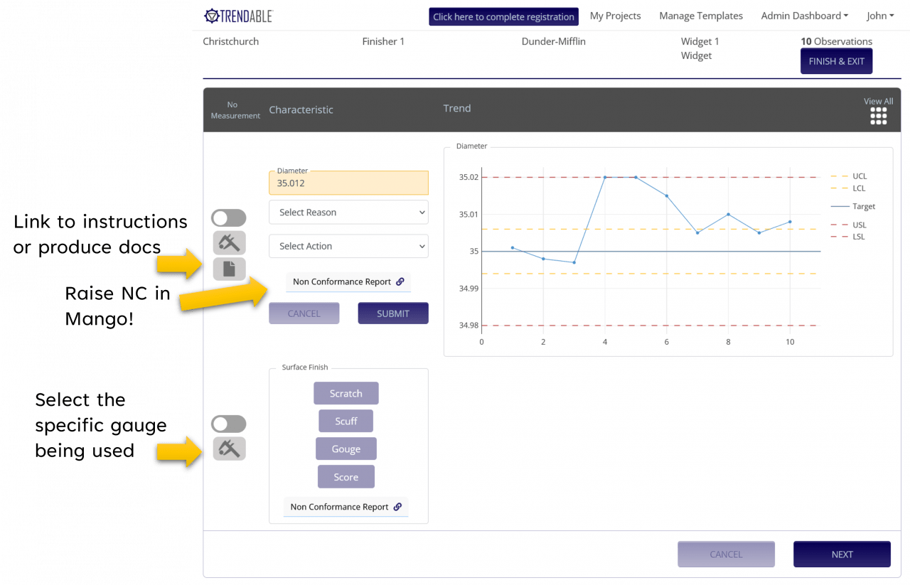 Like any system you can go in and set up your targets, your upper and lower control and spec limits, but you can also tag the work to a specific gauge you are using or a machine you are using along with obviously the specific product you are working on. What that means is that you can surface a bunch of information around the machine, the measuring gauge, the person and of course the product. What I really love is that if your measurement is outside the specified limits, then the software won't let you move on until you tell it why it's outside the limits and what action you will be talking about it.
