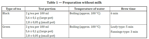 Surely, just the fact there is so much variation means that we need a standard. Well, it turns out there is an ISO standard for this, ISO3103 and its title is "Tea — Preparation of liquor for use in sensory tests", which may give you a hint of its purpose. The idea of the standard, or any standard, is to create consistency. When there is a consistent standard, everything can be repeated and, importantly, compared.