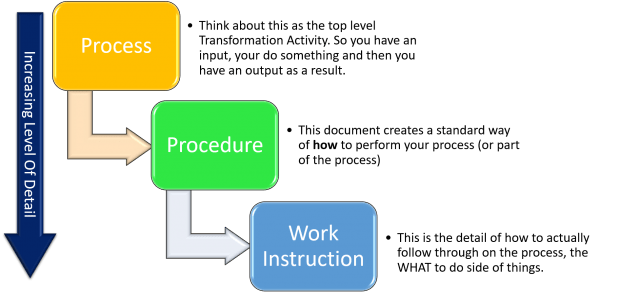 So to recap, a Process (level 1 document) is about transformational activities that you do within your organisation that fall within the scope of yoru ISO9001:2015 Quality Management System, Procedures are level 2 documents that you would create for setting up a uniform process for achieving what you have set up in your processes and work instructions are the level 3 documents that you create that tell you in detail how to do each of the elements of the procedures or processes if you have decided not to include a procedure step.